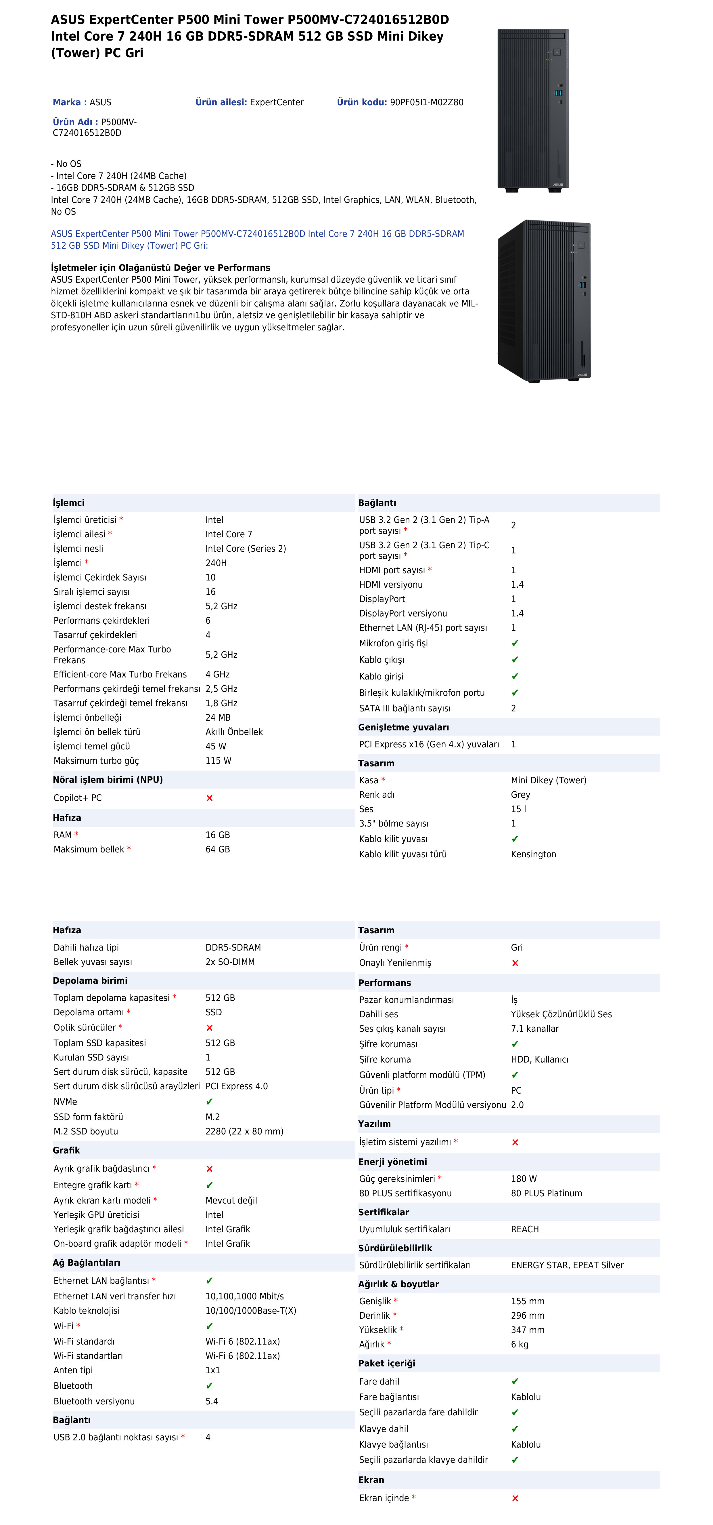 Asus P500mv-c724016512b0d Expertcenter P500, Core 7 240h, 16gb Ddr5 Ram, 512gb Ssd, Paylaşımlı Ekran Kartı, Freedos, Mini Kule Pc