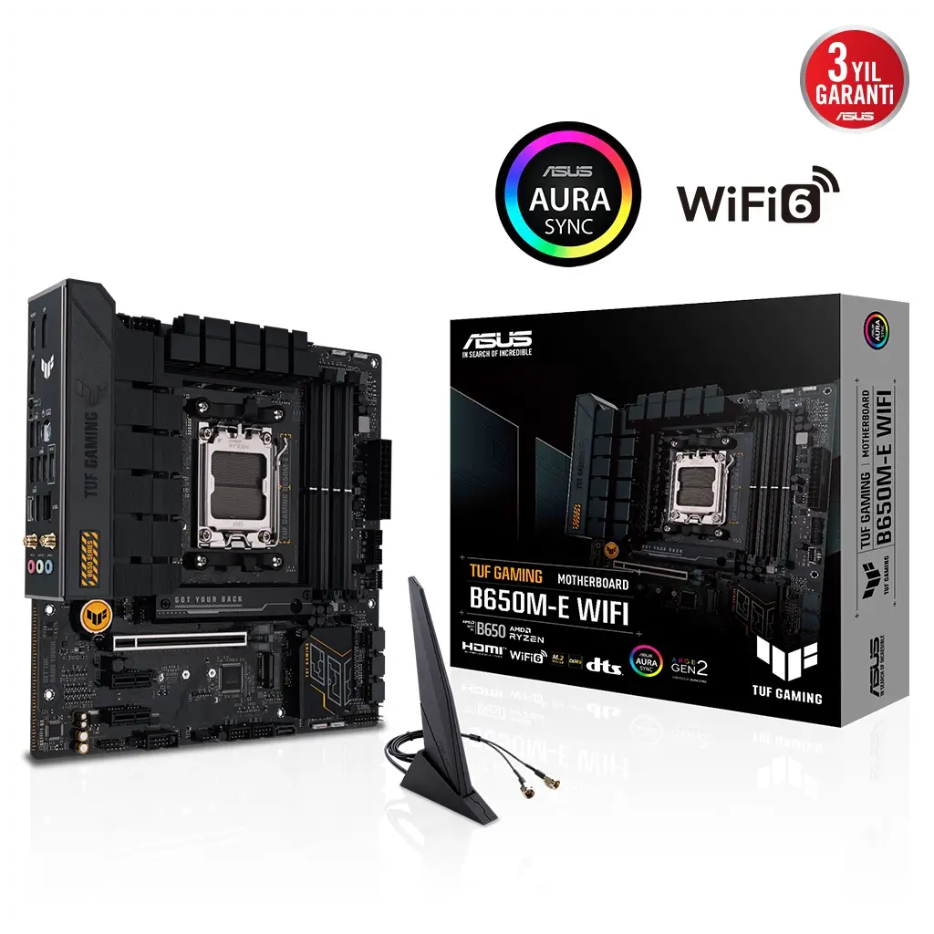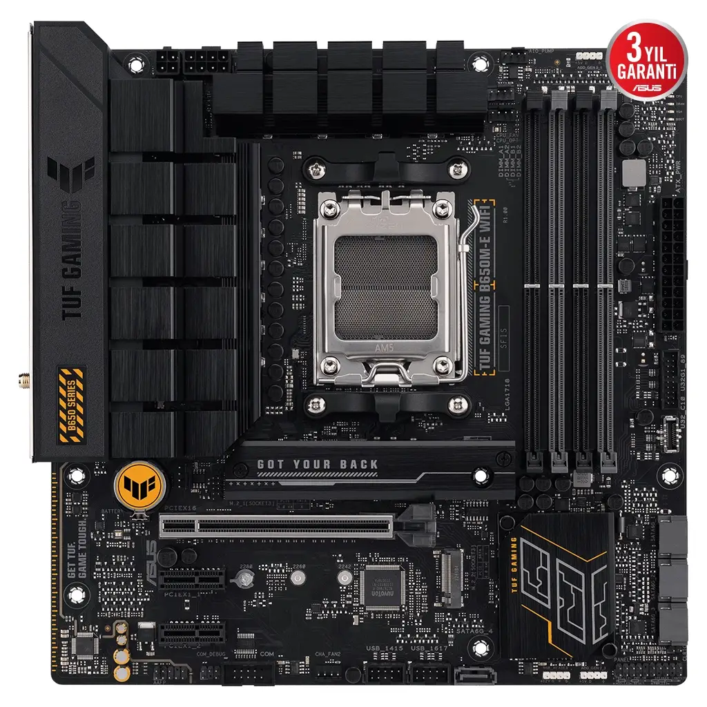 TUF GAMING B650M-E WIFIASUS TUF GAMING B650M-E WIFI, en yeni AMD Ryzen 7000 serisi işlemcilerin en önemli unsurlarını oyunlara yönelik özellikler ve kanıtlanmış dayanıklılıkla bir araya getiriyor. Askeri sınıf bileşenler, gelişmiş güç çözümü ve kapsamlı soğutma sistemiyle donatılan bu anakart, oyun maratonları için kararlı ve sağlam performans ile beklentilerin ötesine geçiyor. TUF GAMING anakartlar, diğerlerinin başarısız olabileceği koşullarla başa çıkabileceklerini garantilemek için zorlu testlerden geçiriliyor. Bu model estetik bakımdan, TUF GAMING serisini tanımlayan güvenilirliği ve kararlılığı yansıtmak için sağlam siyah rengi ve geometrik tasarım öğelerini bir araya getiriyor.