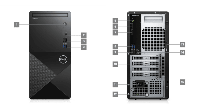 Vostro Tower Masaüstü Bilgisayar, en yeni 13. Nesil Intel ® Core? İşlemciler ve 8 GB bellekle birlikte gelir ; böylece ihtiyaçlarınıza uygun güce sahip olursunuz.