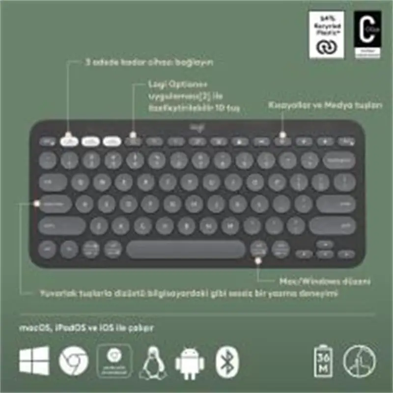 Logıtech K380s Pebble Keys 2 Çoklu Cihaz Özellikli Bluetooth Türkçe Q Klavye Gri 920-011859