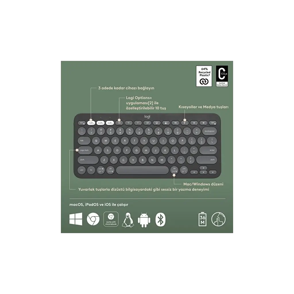 Easy-Switch tuşuna basarak 3 cihaz arasında kolayca geçiş yapabilirsin. Windows, macOS, iPadOS, iOS ve Android ile uyumludur.