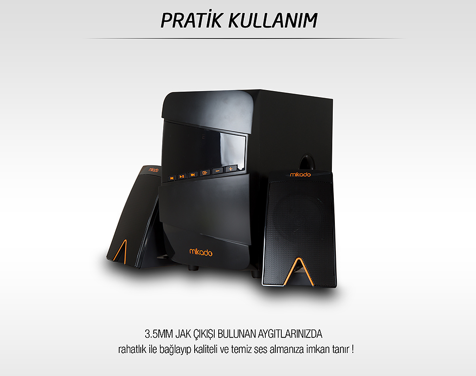 Mikado MD-671BT 2+1 40W RMS Siyah Usb+SD+Fm Destekli Multimedia Bluetooth Speaker ; Harici belleklerinizi MD-671BT'e bağlayarak müzik dinlemenin tadını çıkarın. USB 2.0 ve SD kart giriş yuvaları sayesinde size farklı iki seçenek sunan MD-671BT'e Micro SD kartınızıda Micro SD kart adaptörü yardımı ile bağlayabilirsiniz.
