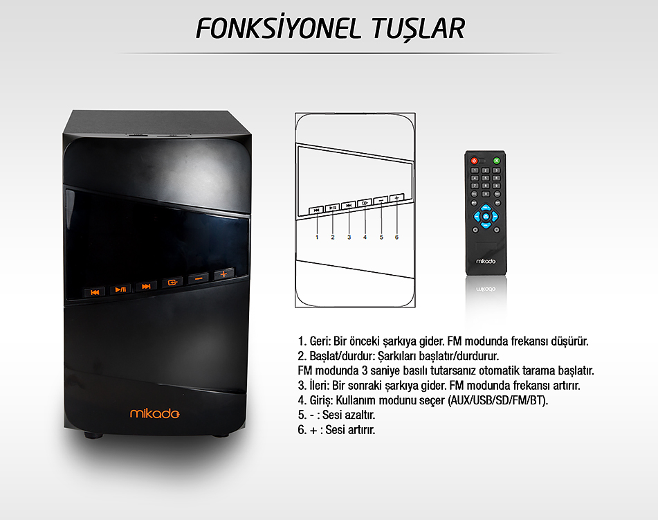 Mikado MD-671BT 2+1 40W RMS Siyah Usb+SD+Fm Destekli Multimedia Bluetooth Speaker ; Üzerinde bulunan fonksiyonel tuşlar ve uzaktan kumanda sayesinde dinlediğiniz müzikleri rahatlıkla ileri alabilir, durdurabilir, geri alabilirsiniz. Mode tuşu ile dilerseniz takmış olduğunuz Flashdisk ve SD karttaki muzikleri dilerseniz de aux ile bağlamış olduğunuz aygıtınızdaki müzikleri rahatlıkla dinleyebilirsiniz. Uzaktan kumandası sayesinde yerinizden kıpırdamadan rahatlıkla aynı işlemleri gerçekleştirmenize imkan tanır !