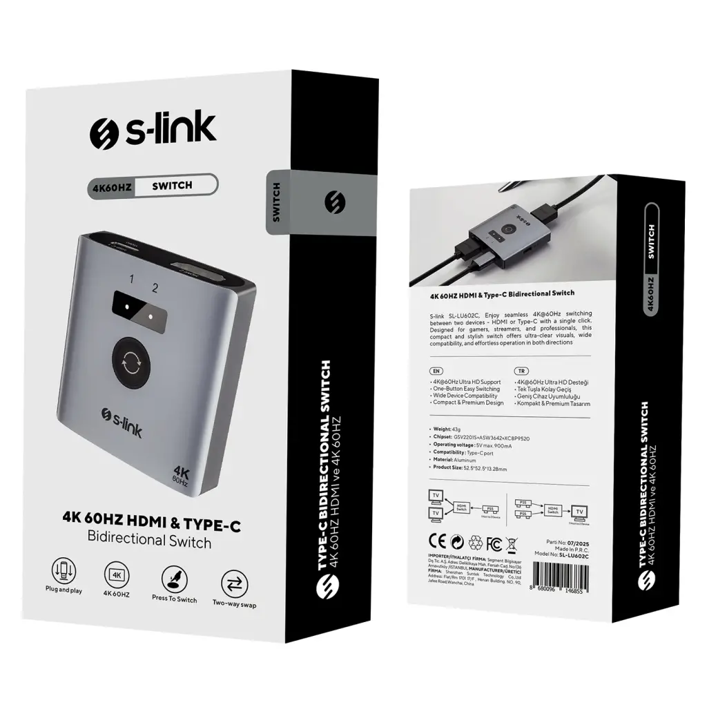 S-lınk Sl-lu602, 2xhdmı, 4k, 60hz, Monitör Çoklayıcı (1pc-2monitör Veya 2pc- 1monitör) Çift Yönlü Switch
