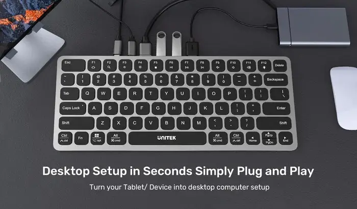 UNITEK'in tak ve çalıştır klavyesiyle tabletinizi veya cihazınızı saniyeler içinde tam teşekküllü bir masaüstü kurulumuna dönüştürün. Karmaşık kurulumlar gerekmez; sadece bağlayın ve kullanıma hazırsınız. Profesyonel ihtiyaçlarınızı karşılayan kullanım kolaylığı ve işlevselliğin keyfini çıkarırken çalışma alanınızın verimliliğini en üst düzeye çıkarın!